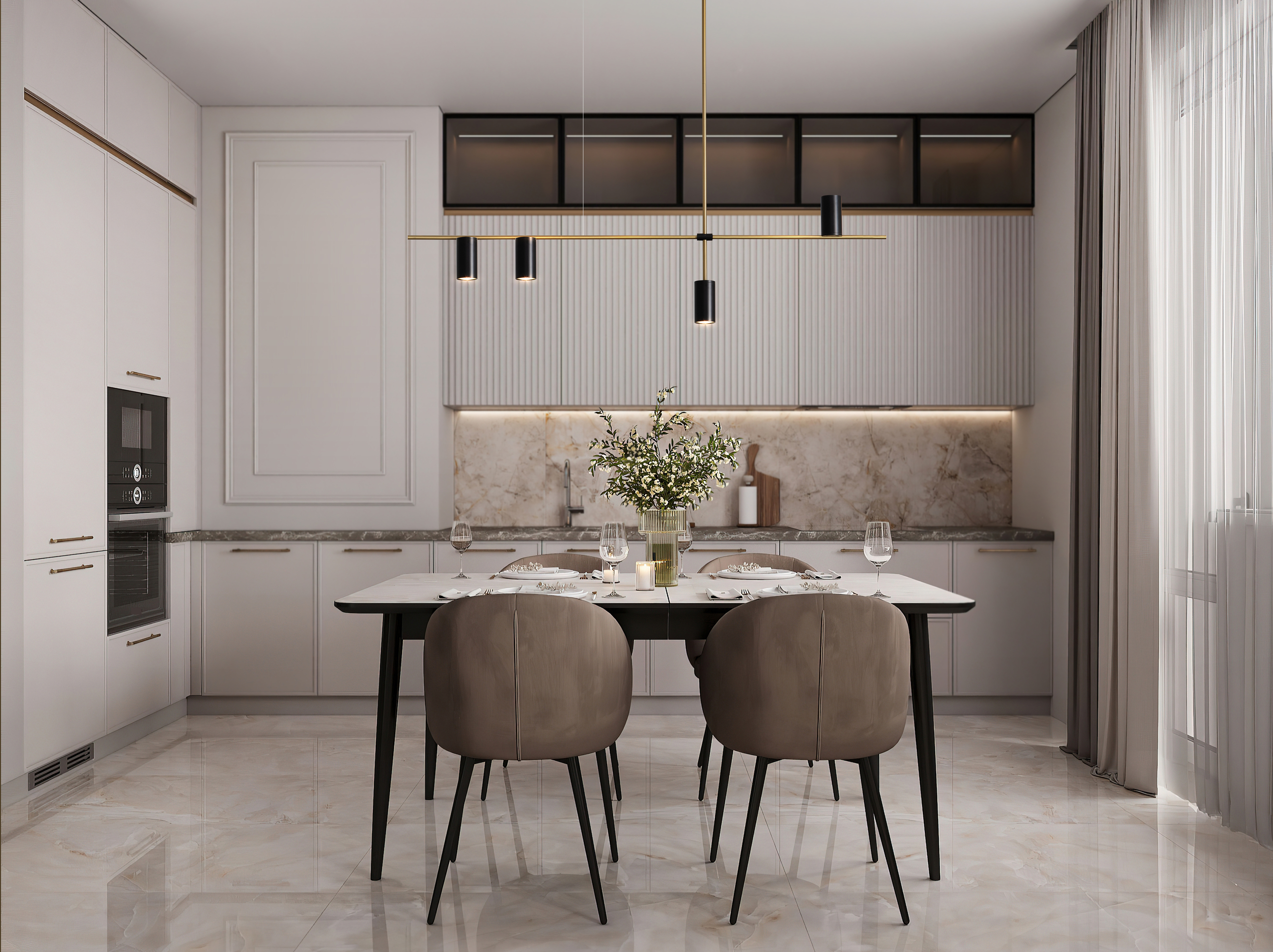 Арматура и плафоны из металла. Черный цвет дополнен латунной окантовкой. Поворотные плафоны и арматура позволяют видоизменять композицию и регулировать направление светового потока. Источник света – лампа GU10.