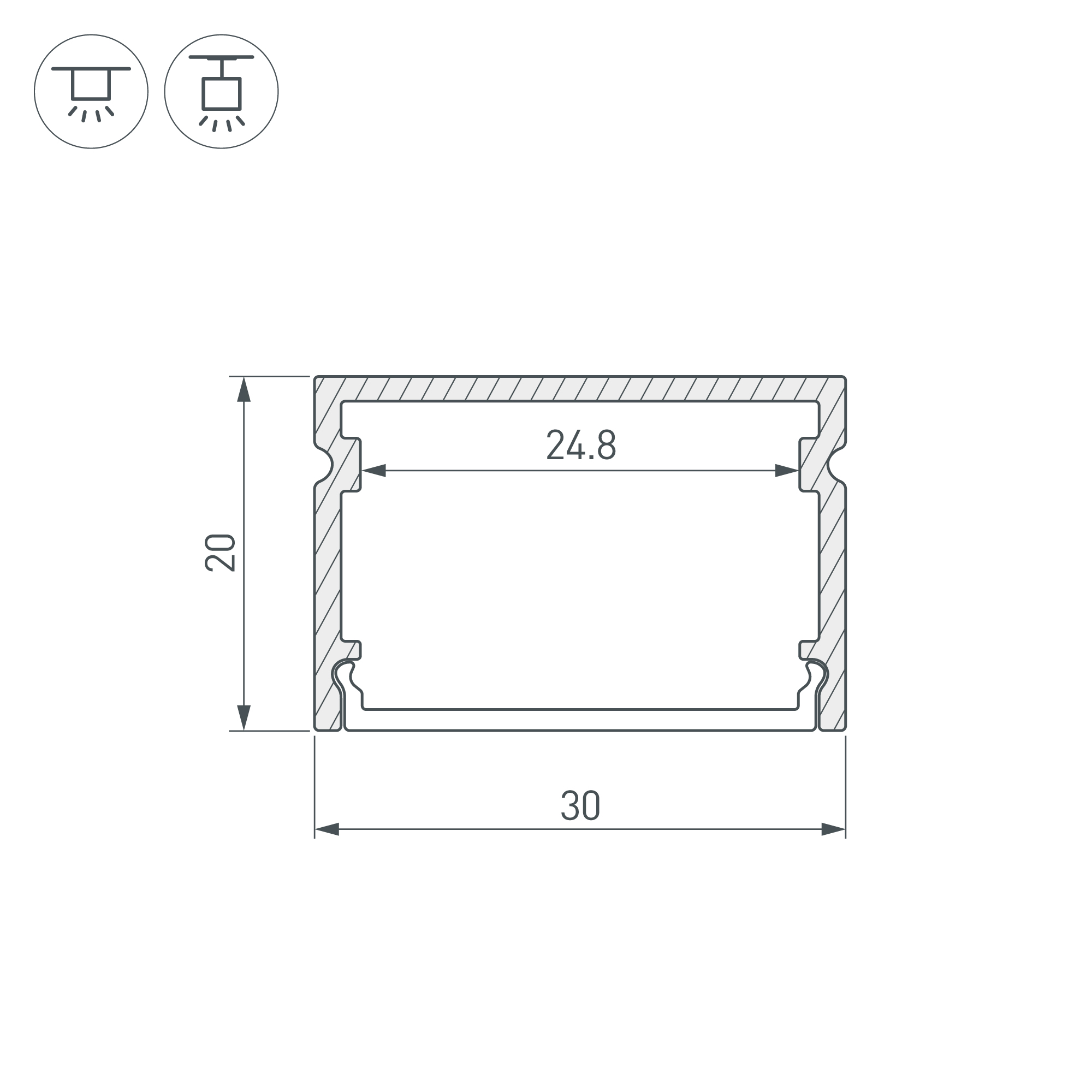 Алюминиевый анодированный накладной профиль для светодиодных лент и линеек. Габаритные размеры (L×W×H): 2000x30x20 мм. Ширина площадки для ленты 24,8 мм. Экраны, заглушки и другие аксессуары приобретаются отдельно. Цена за 1 метр.