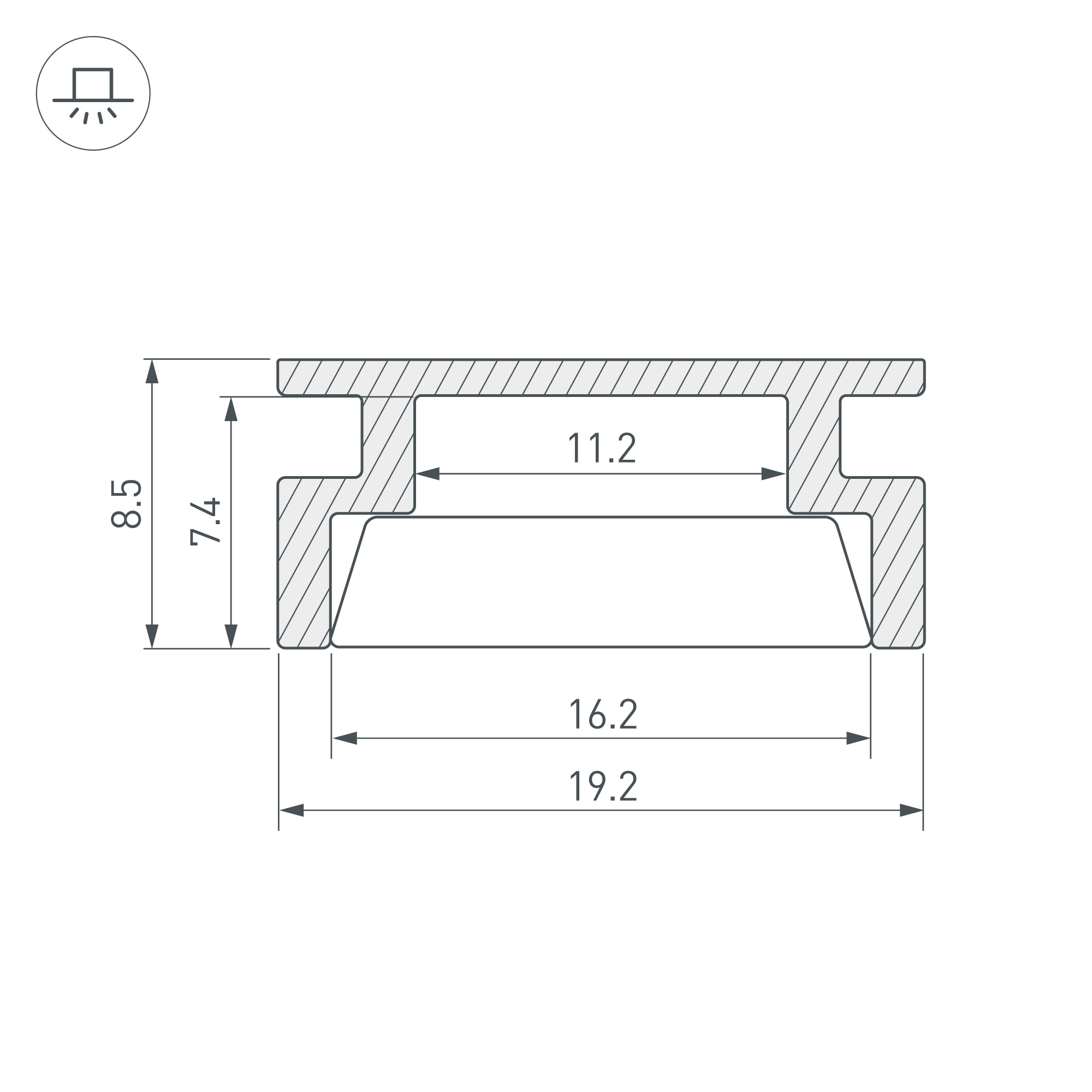 Алюминиевый анодированный профиль, встраиваемый в пол. Высокопрочный алюминий. Герметизация до IP67. Для использования внутри помещений. Габаритные размеры (L×W×H): 2000x19,2x8,5 мм. Ширина площадки для ленты 11,2 мм. Экран (из сверхпрочного поликарбоната, УФ-устойчивый), заглушки и другие аксессуары приобретаются отдельно. Цена за 1 метр.