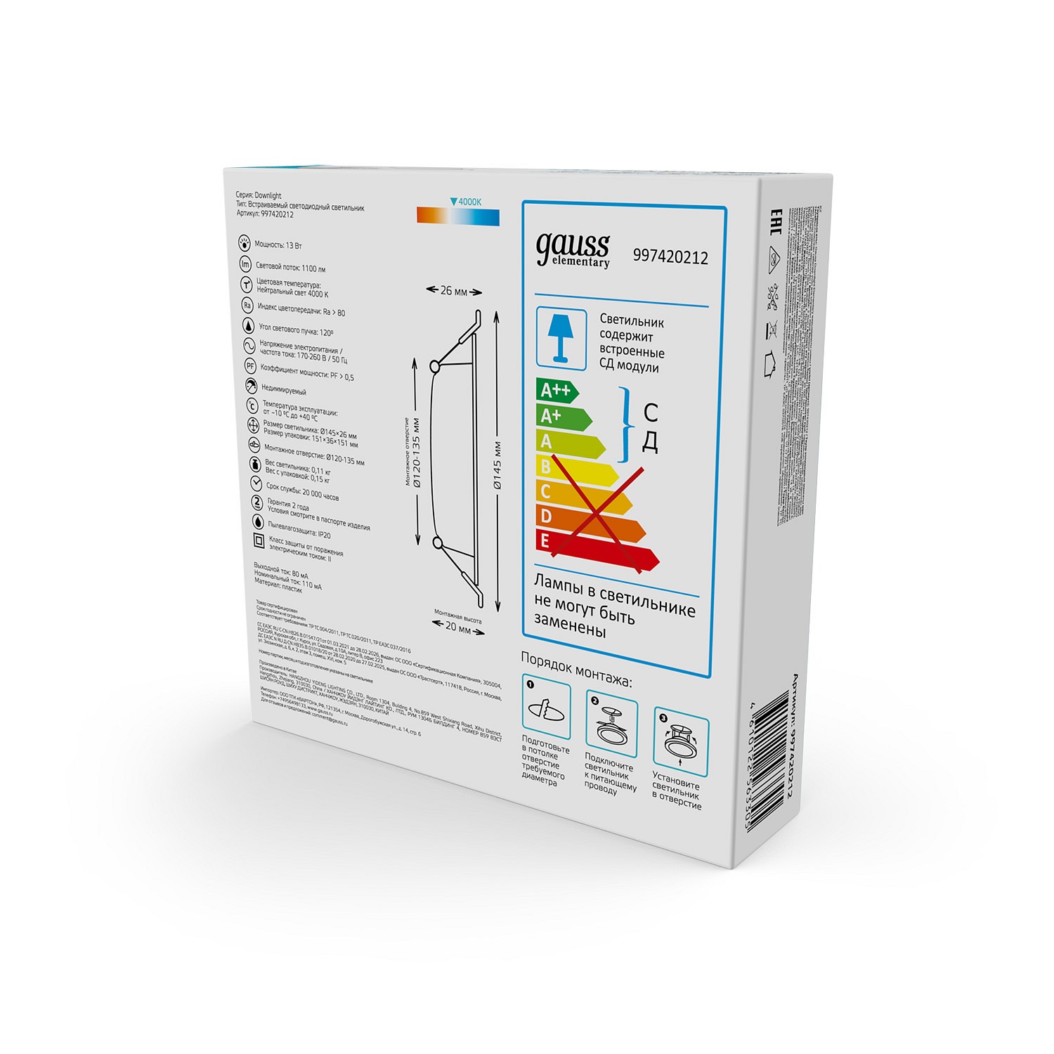 | Альтернативное название | Встраиваемый светильник Gauss Elementary 997420212 |