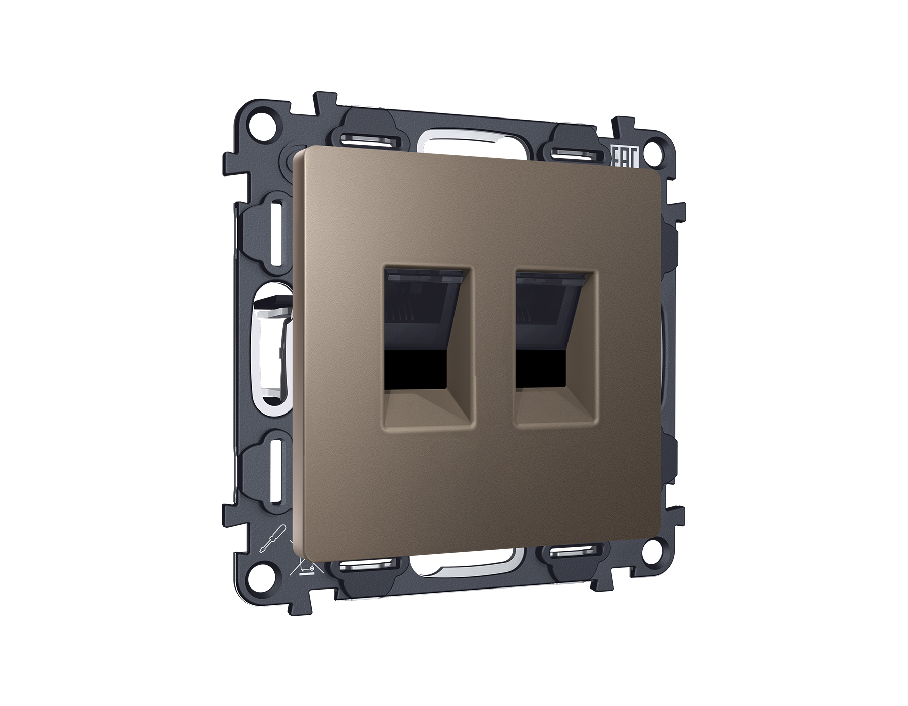 | Альтернативное название | Комплект механизма компьютерной двойной розетки RJ-45 (8P8C) CAT6 с автоматической защитной шторкой ALFA MA642110 Темная бронза матовый QUANT |